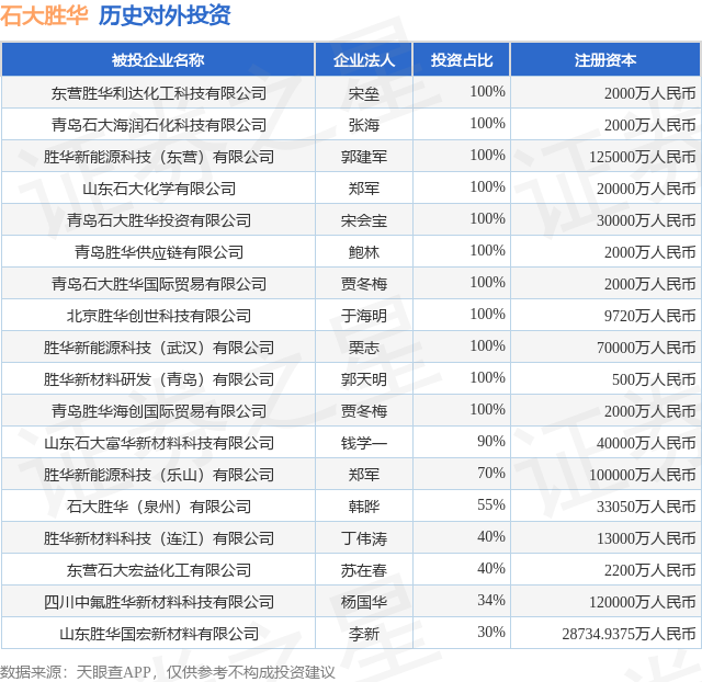 本站消息,根据天眼查APP显示,石大胜华(603026.SH)新增一起对外投资事件恒盈策略,被投资公司为东营胜华利达化工科技有限公司,法定代表人宋垒,投资占比为100%。该公司从事科技推广和应用服务业,注册资本为2000万人民币。目前,石大胜华共存在对外投资18项,详见下表: